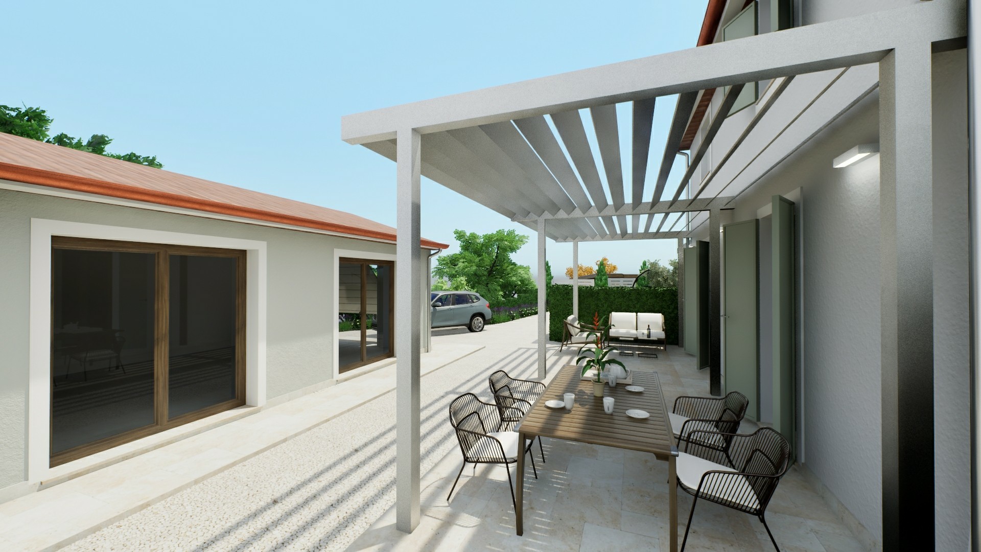 Double covered parking space in the carport, private garden, and pergola, with careful space design to ensure privacy.