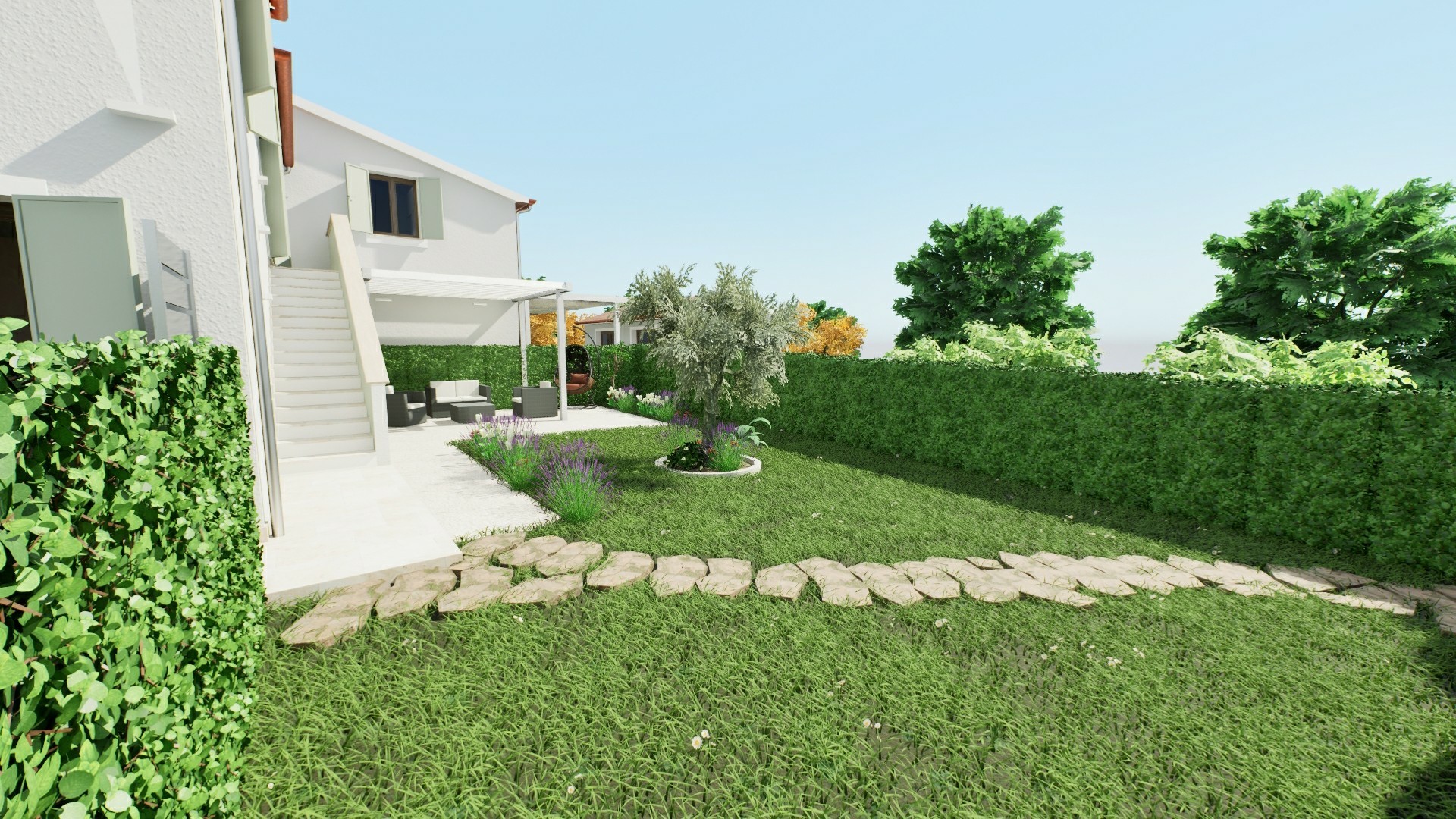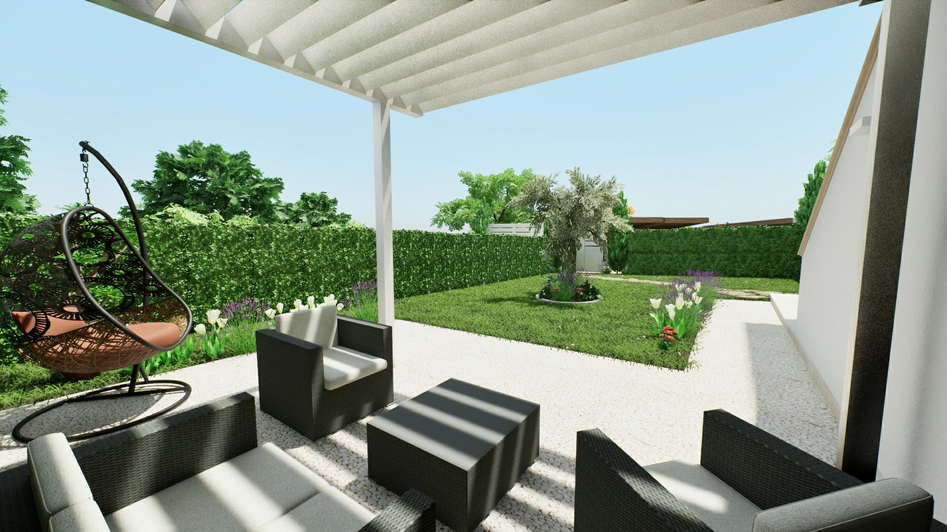 Double covered parking space in the carport, private garden, and pergola, with careful space design to ensure privacy.